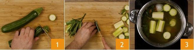 Para preparar o risoto de abobrinha e stracchino, prepare o clássico caldo de legumes, mantendo-o quente. Corte as pontas das abobrinhas 1 e rale todas, exceto uma. Dessa última, extraia a parte verde e corte em palitos 2. As partes brancas, corte em pedaços e, juntamente com as partes cortadas, despeje no caldo 3.