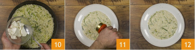 No final do cozimento, desligue o fogo e misture o stracchino até que fique cremoso 10. Emprate e decore com uma pitada de pimenta preta 11. Está pronto o seu risoto de abobrinha e stracchino, bom apetite 12.