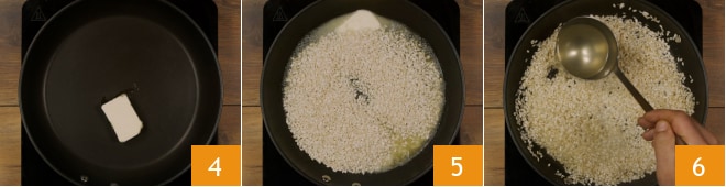 Enquanto isso, derreta a manteiga em uma panela 4, adicione o arroz e deixe tostar por alguns minutos, mexendo frequentemente 5. Comece a cozinhar o arroz adicionando o caldo quente aos poucos: o arroz deve sempre estar coberto com o caldo 6.