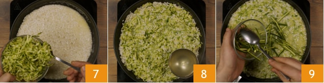 Após alguns minutos, adicione as abobrinhas raladas 7 e continue a cozinhar o arroz, adicionando colheres de sopa de caldo conforme necessário 8. Deixe o caldo ser absorvido, mexendo de vez em quando. Quando estiver quase no final do cozimento, ajuste o sal do arroz e adicione a casca da abobrinha cortada em palitos 9.