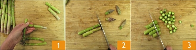 Para preparar o risoto de aspargos, comece com a limpeza dos aspargos: destaque com as mãos a parte mais dura do aspargo, que será usada para o caldo 1. Corte as pontas dos aspargos 2 que servirão para decorar o risoto e corte em rodelas finas o resto dos aspargos 3.