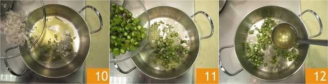 Refogue por alguns minutos com um fio de azeite 10, adicione metade das suas rodelas de aspargos 11, cozinhe por alguns minutos mexendo de vez em quando, ajuste o sal e cubra com uma concha de caldo 12.