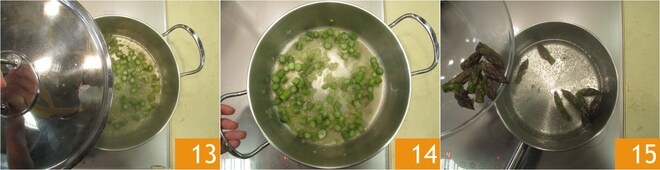 Agora deixe cozinhar por cerca de 5 minutos com tampa 13. Em seguida, deixe esfriar 14. Ferva em água salgada por alguns minutos as pontas de aspargos 15.