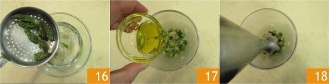 Resfrie-as em água e gelo 16, para que mantenham uma cor brilhante e fiquem crocantes. Enquanto isso, as rodelas de aspargos estarão mornas, bata-as com 15 g de azeite 17 18.