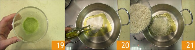 Você deve obter um creme liso e bem verde 19. Agora você tem todos os componentes para começar o cozimento do risoto: aqueça um fio de azeite em uma panela larga 20. Toste o arroz por 3-4 minutos adicionando uma pitada de sal 21.