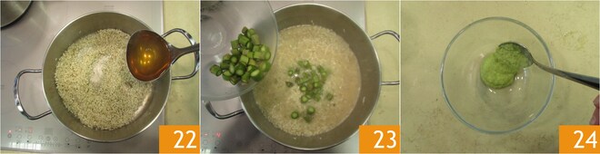 Adicione o caldo 22 até cobrir o arroz e continue cozinhando, adicionando mais caldo conforme necessário. Na metade do cozimento, adicione as rodelas restantes de aspargos 23 e continue cozinhando o risoto ajustando o sal, se necessário. Separe algumas colheres de sopa de creme 24.