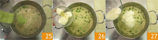 Quando faltarem 2-3 minutos para o risoto estar pronto, adicione o restante do creme 25. Depois de terminar o cozimento, deixe descansar coberto por dois minutos. Finalize com manteiga 26, o queijo ralado 27.
