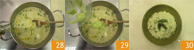 Adicione uma pitada de pimenta, um fio de azeite 28 e o restante do creme de aspargos 29, mexa vigorosamente. Sirva o risoto de aspargos bem quente, decorando os pratos com as pontas de aspargos separadas 30.