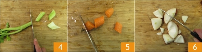 Lave os legumes para o caldo, depois corte grosseiramente o aipo 4, as cenouras 5 e a cebola 6.