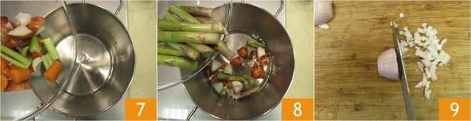 Prepare o caldo: coloque os legumes em uma panela 7, junte também os talos duros dos aspargos que você separou 8. Cubra com água e, começando com água fria, cozinhe por pelo menos meia hora após levantar fervura. Descasque e pique finamente a chalota 9.