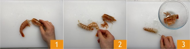 Para preparar o risoto camarões e abobrinha comece com a Como limpar os camarões: remova a cabeça 1, casca e patas (tenha o cuidado de reservar tudo) 2, depois retire o intestino puxando o fio preto 3.
