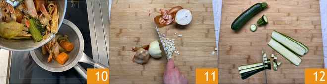 No final do cozimento, coe o caldo 10 e mantenha-o aquecido. Enquanto isso, descasque as cebolas e pique-as finamente 11. Corte as extremidades da abobrinha e corte-a em pedaços de 1 cm 12.