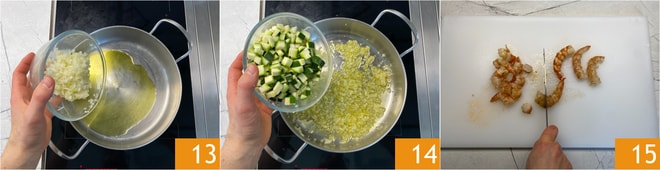 Em uma panela, coloque o óleo e deixe a cebola picada dourar por 1 minuto em fogo baixo 13, depois aumente o fogo, adicione a abobrinha e refogue por cerca de 5 minutos 14. Enquanto isso, corte também os rabos dos camarões em pedaços de 1 cm 15.