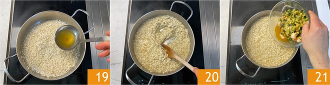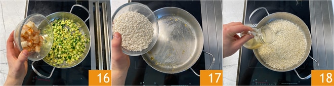 Neste ponto, adicione os camarões e continue a cozinhar por um minuto 16, depois transfira tudo para uma tigela. Na mesma panela, coloque o arroz 17 e torre-o, mexendo frequentemente. Quando os grãos estiverem bem quentes ao toque, adicione o vinho branco 18 e deixe evaporar.