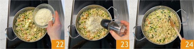 Quando o arroz estiver cozido, desligue o fogo e finalize com manteiga e Parmesão 22, adicione pimenta 23 e misture 24.