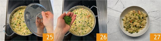 Cubra com a tampa 25 e deixe repousar por alguns minutos. Por fim, aromatize o risoto com cebolinha picada finamente 26. Seu risoto camarões e abobrinha está pronto para ser servido 27!