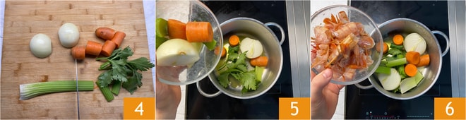 Reserve os rabos dos camarões limpos (melhor se cobertos com um pano úmido). Enquanto isso, limpe e corte grosseiramente o aipo, cenoura e cebola 4. Refogue brevemente no óleo os temperos 5, depois adicione as sobras dos camarões 6.