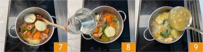 Torre por alguns minutos em fogo alto 7. Adicione a água 8, salgue e deixe ferver suavemente por cerca de uma hora: durante o cozimento, remova a espuma para limpar a superfície das impurezas que surgirem 9.
