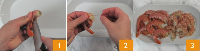 Para preparar o risoto de camarões, limão e prosecco, a primeira coisa a fazer é preparar o caldo de legumes. Passe para a limpeza dos crustáceos: remova a cabeça e faça um corte no ventre com a ponta de uma faca 1, depois retire o intestino 2. Descasque metade dos camarões e deixe a outra metade com o exoesqueleto 3.