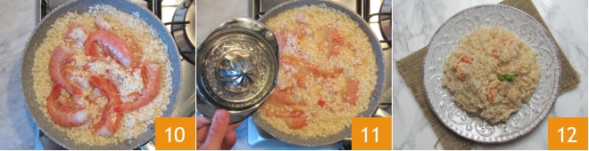 Quando faltarem 5 minutos para o término do cozimento do arroz, adicione tanto os camarões descascados quanto os com exoesqueleto 10, despeje o suco de limão 11 e termine o cozimento adicionando mais uma concha de caldo, se necessário. Sirva seu risoto de camarões, limão e prosecco decorado com uma espiral de casca de limão 12!