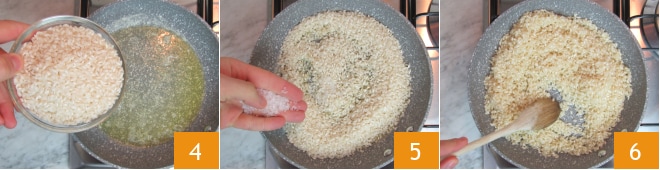 Derreta a manteiga em uma panela grande, depois adicione o arroz 4 e toste por alguns minutos adicionando o sal 5 e mexendo continuamente 6.