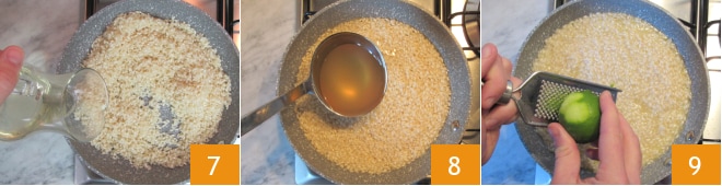 Neste ponto, regue com o prosecco 7 e deixe o álcool evaporar completamente, depois cozinhe o arroz adicionando uma concha do caldo de cada vez 8. Enquanto o arroz cozinha, acrescente a casca ralada do limão 9, depois esprema o suco e reserve.