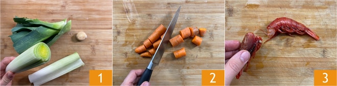 Para preparar o risoto com camarões e alho-poró, limpe o alho-poró cortando as folhas verdes e a base, depois descasque para eliminar a parte mais externa 1. Lave e guarde as sobras. Lave e corte a cenoura em pedaços 2. Por fim, limpe os camarões e reserve as cascas 3.