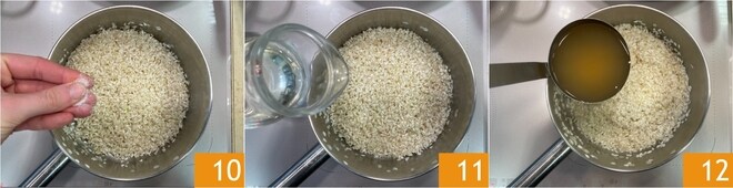 Ajuste o sal 10 e toste por alguns minutos. Despeje o vinho branco 11 e deixe evaporar toda a parte alcoólica. Regue com caldo de legumes 12 e cozinhe até ficar pronto.