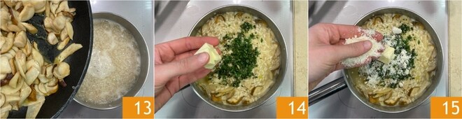Quando faltarem 5 minutos para o término do cozimento, adicione os cogumelos 13 e termine de cozinhar. Adicione a salsinha picada, a manteiga 14 e o Parmesão 15.