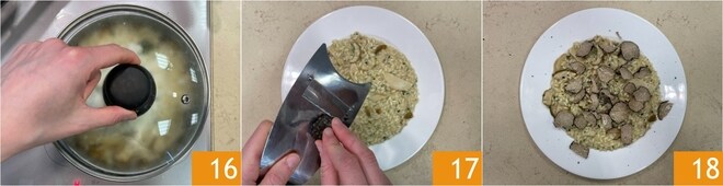 Desligue o fogo, cubra com uma tampa e deixe a manteiga derreter por alguns minutos. Misture bem e sirva 16. Complete com algumas fatias de trufa negra fresca 17. O risoto de cogumelos e trufa está pronto para ser apreciado 18.