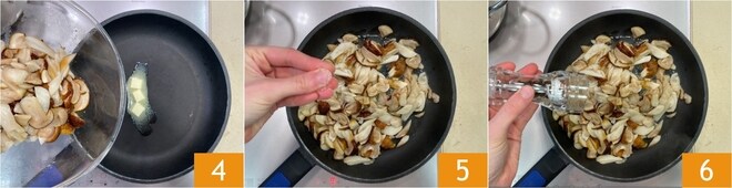 Em uma panela, coloque a manteiga e um dente de alho com casca. Quando a manteiga derreter, adicione os cogumelos porcini 4 e cozinhe por 5 minutos, salteando. Assim que ficarem macios, ajuste o sal 5 e a pimenta 6.