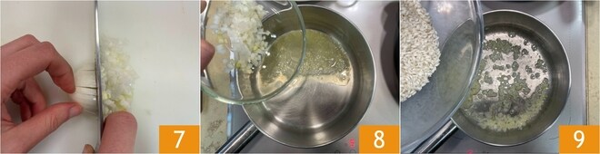 Pique finamente uma cebola e reserve 7. Em uma panela, derreta a manteiga, adicione a cebola e refogue por alguns minutos 8. Adicione o arroz 9.