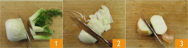 Para preparar o risoto de erva-doce e primosale, primeiro limpe a erva-doce guardando as sobras 1. Em seguida, fatie-as finamente 2. Divida a cebola ao meio 3.