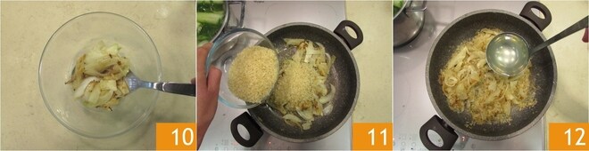 Transfira um terço da erva-doce cozida para uma tigela e reserve para decorar o prato 10. Coloque o arroz na frigideira com a erva-doce cozida 11, salgue e torre em fogo alto por um par de minutos, depois cubra tudo com o caldo preparado com as sobras 12.