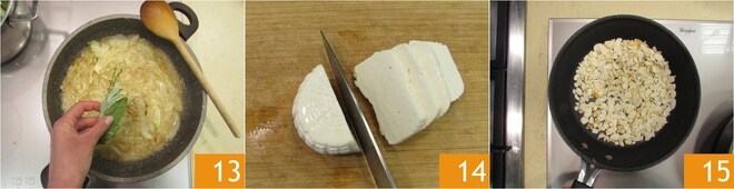 Adicione também as ervas aromáticas 13. Cozinhe o arroz acrescentando caldo conforme necessário por cerca de 20 minutos. Corte o primosale em fatias 14. Em uma frigideira, toste as amêndoas em lâminas 15.