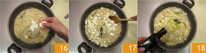 Após o tempo de cozimento, desligue o fogo e misture o risoto com o primosale esmigalhado 16, mexa 17 e finalize com um fio de azeite 18. Emprate decorando com a erva-doce reservada, as amêndoas tostadas e algumas folhas de sálvia. O risoto de erva-doce e primosale está pronto para ser degustado.