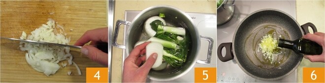 Pique finamente uma das metades da cebola 4. Coloque em uma panela cheia de água as sobras da limpeza da erva-doce e a outra metade da cebola 5. Deixe ferver. Enquanto isso, adicione um fio de azeite e a cebola picada em uma frigideira 6.