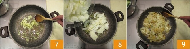 Refogue a cebola por alguns minutos 7. Acrescente também a erva-doce fatiada 8 e salteie na frigideira até dourar 9.