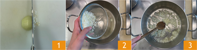 Para preparar o risoto de gorgonzola, prepare o Caldo de legumes e mantenha-o aquecido. Descasque e pique a cebola 1. Refogue em fogo baixo com 25 g de manteiga em uma panela 2 até murchar 3, levará cerca de 10 minutos.