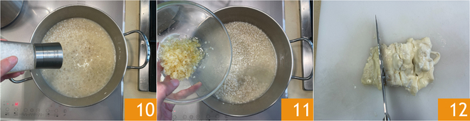 Adicione sal 10, adicione a cebola que você reservou 11 e cozinhe o risoto, adicionando caldo de legumes conforme necessário. Enquanto isso, corte o gorgonzola em pedaços 12.