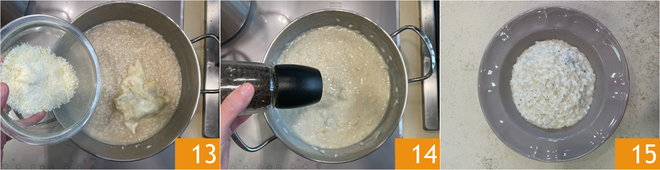 No final do cozimento, desligue o fogo e adicione o gorgonzola e o Parmigiano Reggiano DOP para misturar 13. Finalize com pimenta moída na hora, se desejar 14. O risoto de gorgonzola está pronto para ser servido 15.