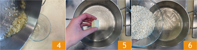 Reserve a cebola 4. Na mesma panela, derreta os outros 25 g de manteiga 5. Uma vez derretida, você pode adicionar o arroz 6.