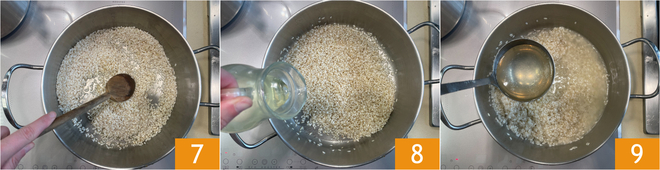 Toque o arroz em fogo moderado, mexendo com frequência 7, depois adicione o vinho branco 8, deixe evaporar e comece a cozinhar com uma ou duas conchas de caldo de legumes quente cobrindo 9.