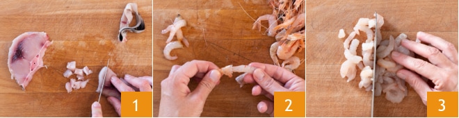 Para preparar o risoto de laranja com espada e camarões, a primeira coisa a fazer é cuidar do peixe: limpe o peixe-espada removendo a pele e o osso central, depois corte a polpa em cubos 1. Descasque os camarões removendo a cabeça e a carapaça 2, retire o fio preto das costas e pique a polpa com a faca 3.