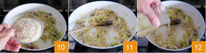 Agora adicione o arroz 10 e toste em fogo alto por alguns minutos, mexendo sempre 11. Regue com espumante 12 e deixe evaporar completamente, depois reduza o fogo e ajuste o sal e a pimenta.