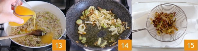 Neste ponto, cozinhe o arroz adicionando o suco de laranja aos poucos, mexendo sempre e esperando o líquido ser absorvido antes de adicionar mais 13. Enquanto isso, aqueça bastante óleo em outra panela e frite os alhos-porós reservados 14, depois escorra e transfira para papel absorvente para eliminar o excesso de óleo 15.