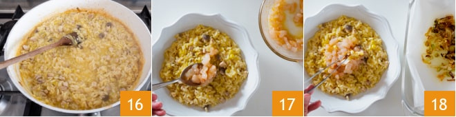 Quando o arroz estiver cozido 16, desligue o fogo, adicione um fio de óleo cru e deixe descansar por alguns minutos. Coloque o risoto nos pratos e complete adicionando no centro de cada prato uma colher de camarões marinados 17 e uma porção de alhos-porós fritos 18.