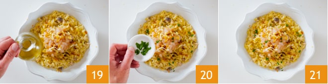 Tempere com um fio de óleo 19, decore com salsinha picada 20 e sirva seu risoto de laranja com espada e camarões 21!