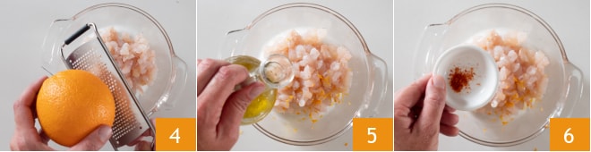 Transfira os camarões para uma tigela, adicione a raspa de laranja 4, óleo 5, sal e uma pitada de pimenta vermelha 6. Misture bem, cubra com filme plástico e coloque na geladeira para marinar enquanto continua com a receita.
