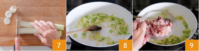 Agora limpe os alhos-porós e corte-os em rodelas 7, depois reserve cerca de 50 g. Doure o restante dos alhos-porós em uma panela onde você já tenha aquecido um fio de óleo 8, em seguida, adicione o peixe-espada 9 e deixe apurar brevemente.